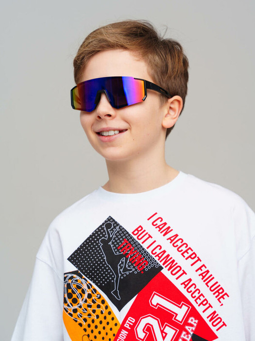 Солнцезащитные очки футуристической формы для мальчика подростка. Солнцезащитные очки с фильтром Cat3. Ширина оправы - 130 мм, длина дужки - 115 мм. Обхват головы 52-54 см. Тёмные фильтры блокируют 85% солнечных лучей такие очки эффективны для защиты глаз в тропиках, у моря и в горах. Очки транспортируются в картонной коробке. В комплект входит фирменный текстильный чехол из микрофибры, с помощью которого легко ухаживать за изделием.
