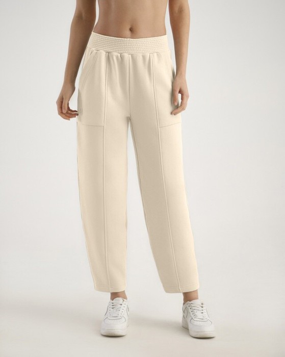 Брюки-бананы. Передние половинки брюк со швом. Накладные карманы по передним боковым половинкам брюк,между швами. Пояс из основной ткани, отстрочен.