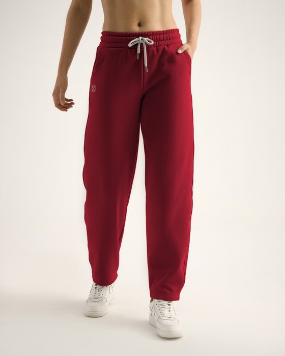 Брюки-бананы из интерсофта свободного кроя с боковыми карманами, зауженные к книзу. Широкий эластичный пояс со шнуром.