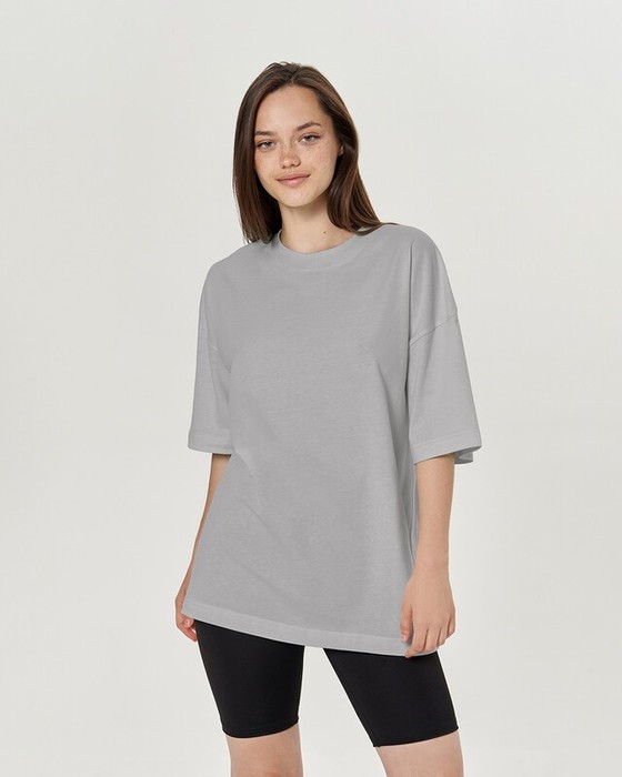 Футболка свободного силуэта. Спущенное плечо. Горловина из двух деталей, из рибаны.