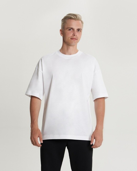 Футболка свободного силуэта. Спущенное плечо. Горловина из двух деталей, из рибаны. Укрепление бейкой плечевых швов и горловины спинки.