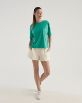 Boyfriend крой, укрепление по горловине спинки, круглый вырез. Горловина рибана. Отстрочка по горловине переда