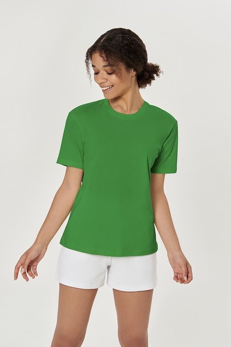 Футболка полупрелигающего силуэта, втачной рукав, горловина окантована рибаной
