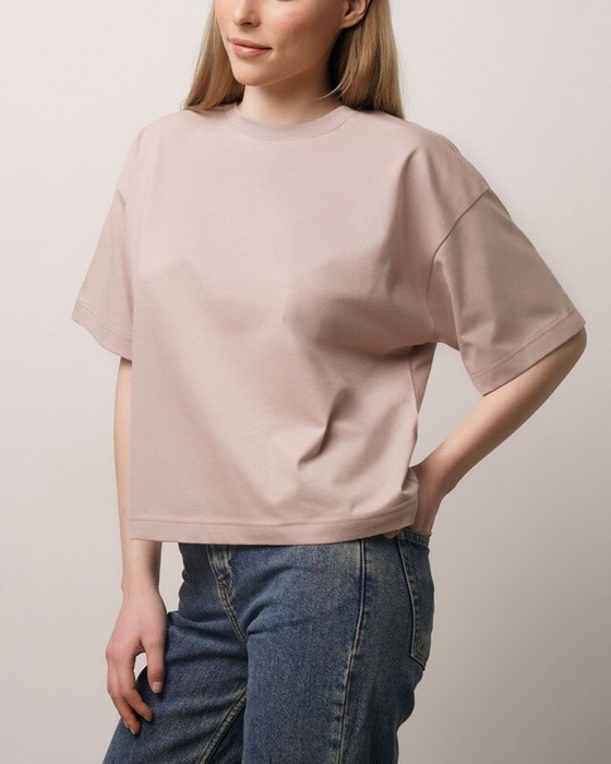 Укороченная футболка, спущенное плечо.Укрепление плечевых швов и шва горловины бейкой из основной ткани. Горловина из рибаны.