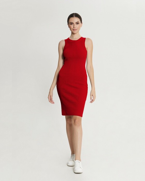 Платье средней длины из кашкорсе, облегающего силуэта, с широкой окантовкой пройм и горловины из рибаны.
