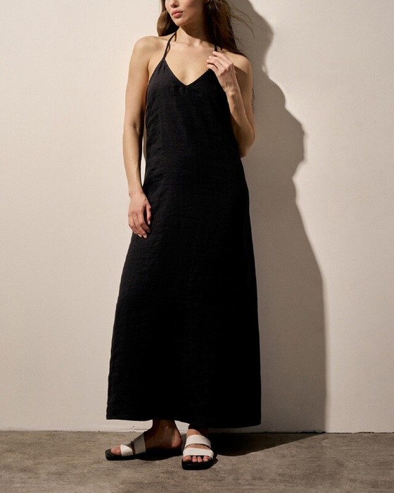 Сарафан длинный из льна с V-образным вырезом . Открытая спинка Завязывается на шее.