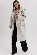 Застежка центральная на двустороннюю молнию от верха до низа под планкой и кнопки по краю борта.