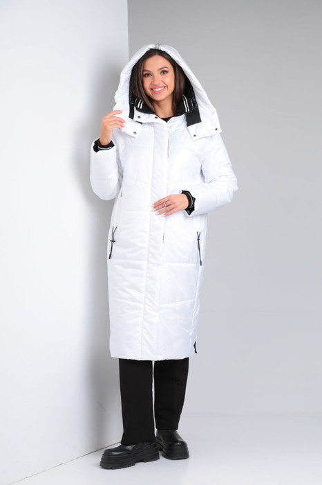 Пальто женское полуприлегающего силуэта, с центральной застежкой на тесьму-молнию и планку (потайные кнопки). Карманы в рельефах с отрезной листочкой (на листочке отделочные кулисы, протянут шнур - резинка с фиксатором) . Спинка с отрезными бочками , по низу рельефов шлицы с застежкой на кнопки. Рукав втачной, одношовный с отделочным манжетом по низу (довяз). Воротник- стойка, нижний воротник из отделочной ткани (довяз). Капюшон объемный (на кнопках) с центральной частью и с отделочной частью по отлету, с застежкой на кнопки. В качестве отделки используется фурнитура и детали.