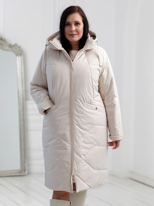 Зимнее пальто прямого силуэта с застежкой на двухзамковую молнию, которая позволяет регулировать ширину шага при необходимости. Воротник - уютная стойка, переходящая в капюшон. Комфортности придают удобно расположенные карманы на кнопках. Есть внутренний кармашек на молнии. Длину втачного рукава можно корректировать отворотом. Модель такого пальто средней длины подходит для девушек и женщин разных возрастных категорий. Плащевая ткань, из которой выполнено изделие, имеет водоотталкивающую пропитку, выдерживающую небольшой дождь, снег и ветер. Хорошо зарекомендовавший себя утеплитель "Холлофайбер", плотностью 300г/м, защитит от холода. Подкладка в изделии выполнена из ткани в мелкую полоску.