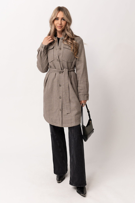 Пальто с центральной двубортной застежкой на петли и пуговицы, отложным воротником. По переду – накладные карманы с клапанами. Спинка цельная. Линия низа фигурная. В боковых швах расположены карманы. Рукав с отрезной манжетой. Пальто на подкладке.