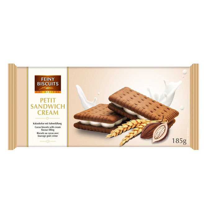 Печенье с начинкой из какао-крема 185г Ингредиенты: МУКА ПШЕНИЧНАЯ, жиры растительные (пальмовый, рапсовый), сахар, сухая сладкая сыворотка (из МОЛОКА), какао-порошок нежирный 3%, инвертный сахарный сироп, шоколад 0,6% (содержит сою), разрыхлители: Е450, Е500, Е503; глюкоза, эмульгатор: E322; соль, краситель: E150c; сухие сливки 0,2% (из МОЛОКА), ароматизаторы, средство для обработки муки: E223 (содержит СУЛЬФИТ). Аллергены: Может содержать следы орехов, яиц, арахиса и кунжута. Пищевая ценность на 100 г Энергетическая ценность 2122 кДж 507 ккал Жир 25 г из них насыщенные жирные кислоты 12 г Углеводы 64 г из них сахара 33 г Белок 6 г Волокна 0,90 г Соль (= натрий х 2,5) 0,63 г