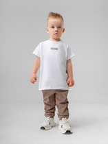 Брюки для мальчиков. Джинсы с начёсом, небольшого объёма, заужены к низу; пояс из рибаны с регулировкой ширины; по боковому шву лампасы из тесьмы с надписью "Рождён быть первым".