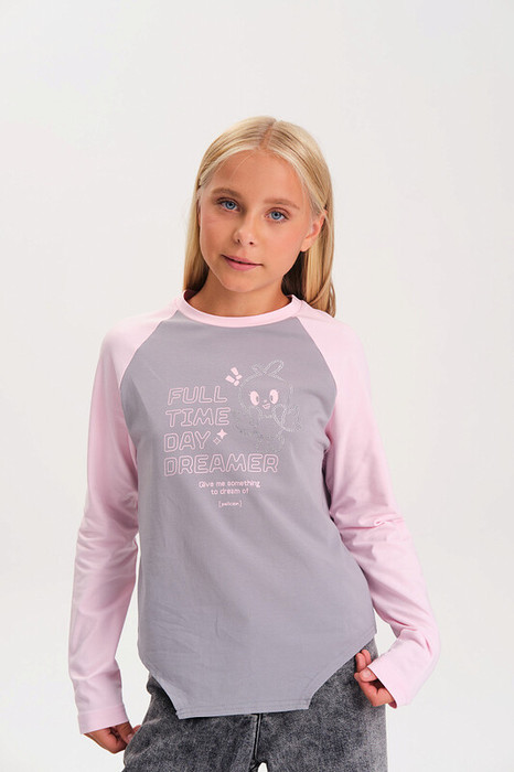Лонгслив для девочки из хлопка с эластаном — с принтом и стразами