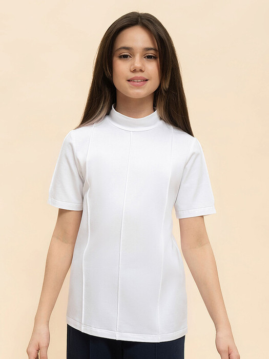 Трикотажная блузка умеренного объема. Невысокий воротник. Фишкой являются застроченные три защипа по переду и по одному защипу на рукаве по всей длине переда и рукава.