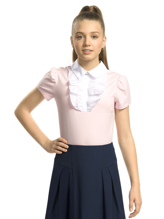 Футболка с коротким, слегка присборенным рукавом и стильным декором то, что нужно вашей умнице. Имитация классического рубашечного воротничка в сочетании с пришивным жабо олицетворяет бессменную классику. Тонкое кружево вдоль декоративной планки и маленькая пуговка-жемчужинка, обрамленная сверкающими стразами, делают образ более романтичным и запоминающимся. Состав изделия не предполагает трудностей в уходе, а застежка сзади позволяет легко надевать и снимать изделие, не цепляя ворот блеском для губ