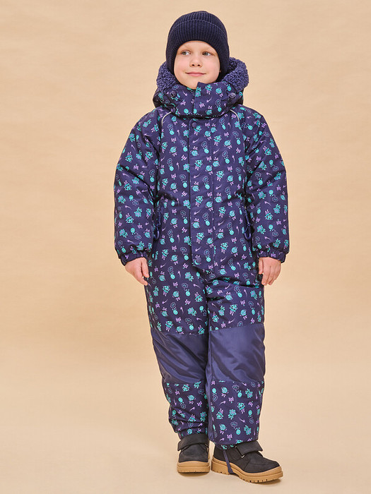 Комбинезон зимний детский из мембранной ткани для мальчика. Модель свободного объёма с рукавами кроя реглан подарит ребёнку комфорт и не будет стеснять его движений. На внешнюю поверхность материала нанесена водоотталкивающая пропитка (DWR), она задерживает грязь и влагу снаружи — ребёнок не промокнет от снега, а комбинезон легко отстирается. Также есть дополнительная пропитка на внутренней стороне ткани — для более надёжной защиты от промокания. Капюшон двухшовный, что обеспечивает анатомически правильную форму и комфортную посадку по голове. Капюшон не отстегивается, предусмотрена регулировка объема эластичными шнурами с пластиковыми стопперами. Внешний край капюшона декорирован мягким искусственным мехом, по текстуре напоминающим «барашка». Из этого же материала выполнена внутренняя подкладка капюшона, она комфортная, тактильно приятная. Удобная центральная застёжка на тракторную молнию. Тканевый стоппер защищает подбородок от зажима молнией. Фиксирующая строчка предохраняет планку от «заедания» в процессе застёгивания. Комбинезон тёплый — для оптимальной защиты от ветра и холода центральная молния дополнительно закрыта ветрозащитной планкой на кнопках и липучках (велькро). Спинка по талии присборена на внутреннюю резинку — комбинезон зимний для мальчика безупречно садится по фигуре и не выглядит мешковато. Внутри комбинезона эластичные лямки — есть возможность снимать только верхнюю часть в помещении. Карманы с боковым входом закрываются на молнию, по контуру резиновая заливка — содержимое карманов не промокнет от снега во время активных игр на свежем воздухе. Внутри карманы утеплены мягким флисом. Замок дополнен тканевыми стопперами, что предохраняет его от разрыва. На пуллере эластичный запаянный шнур — ребёнку легко открывать и закрывать даже в варежках. Манжеты рукавов и брючин на комфортных широких резинках, это предохраняет от попадания внутрь снега. На муфтах брюк антискользящая резинка. Комбинезон дополнен съёмными силиконовыми штрипками. Область колен и нижняя часть спинки усилены более плотной тканью — можно смело кататься с горки и ползать на коленках сколько захочется. В каждом изделии нейм-лейбл! Ребёнок не потеряется и не потеряет комбинезон! Световозвращающие канты в проймах переда и спинки — безопасность в тёмное время суток. Модель красивого трендового цвета декорирована сплошным принтом. Комбинезон на молнии неприхотлив в уходе — ухаживать согласно указанным на вшивных ярлыках рекомендациям. Изделие выполнено из полиэстера с мембраной — оно не только защищает от холода и влаги, но и хорошо пропускает воздух, давая коже ребёнка дышать. Подкладка из мягкого, тёплого и дышащего флиса (по переду и спинке). В рукавах и штанинах подкладка из тонкого и гладкого полиэстера —  благодаря этому ребенку легко надевать комбинезон, руки и ноги не путаются в рукавах и штанинах, а легко проскальзывают. Зимний комбинезон детский идеален для маленьких мальчиков дошкольного и младшего школьного возраста. Рекомендуемый температурный режим: не ниже минус 25 градусов. В изделии использован один из высокотехнологичных утеплителей — феллекс 260 г/м2. Дышащие свойства мембраны: не менее 3000 г/м2/сут. — ребёнку будет комфортно на прогулке. Модель подходит для носки в детский сад, для прогулок и отд