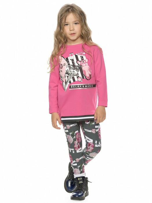 Комплект для девочек: туника и лосины. Туника из футера умеренного объёма, рукав небольшого объема, слегка зауженный книзу, боковые швы переведены на перед, внизу с разрезами, по низу переда настрочена трикотажная тесьма, перепад длины переда и спинки, перевод Расслабься и послушай музыку. Классические лосины из футера с начесом.