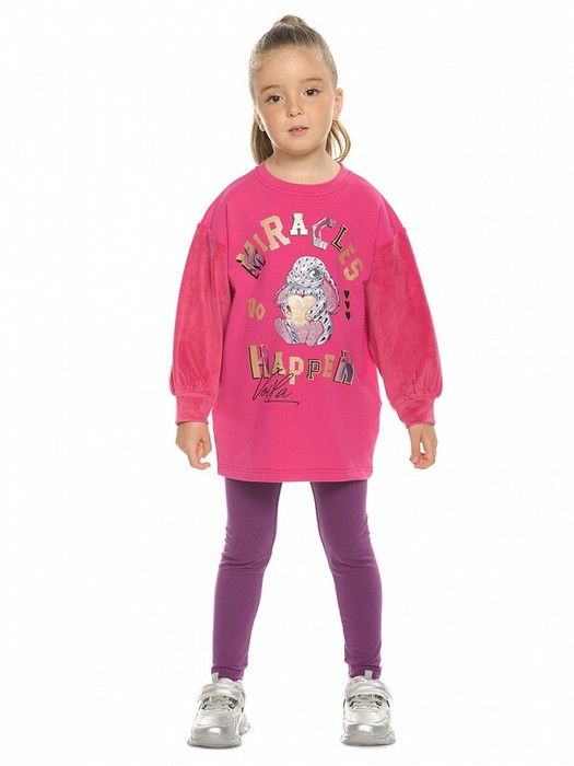 Комплект для девочек туника и лосины. Туника мягкого оверсайз силуэта со спущенной линией плеча. Перед и спинка из футера, рукава из мягкого плюшевого велюра с перламутровым отблеском. Эластичный rubber принт с золотым металликом и глиттером. Надпись Чудеса случаются. Вуаля. Низ Классические лосины из футера с начесом.