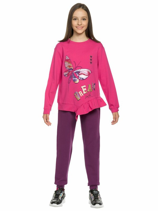 Комплект из футера для девочек свитшот и брюки. Свитшот расслабленного силуэта. Rubber принт с золотым металликом и глиттером. Надпись Мечта. Вуаля. По низу изделия декоративный, асимметрично расположенный волан из основной ткани. Брюки на манжете из рибаны увеличенного, актуального объема без защипов. Пояс из основной ткани с эластиком внутри и дополнительной регулировкой объема шнурком.