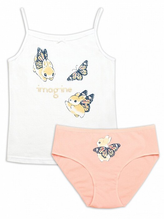 Комплект для девочек майка и трусики. Майка на тонких бретелях, отделка горловины, пройм и сами бретели из пайпинга. Декор атласным бантиком. Прочный принт, надпись с золотом. Перевод Воображай. Трусики слипы. По талии эластик с фестонным краем, обработка эластиком по ноге. Прочный принт.