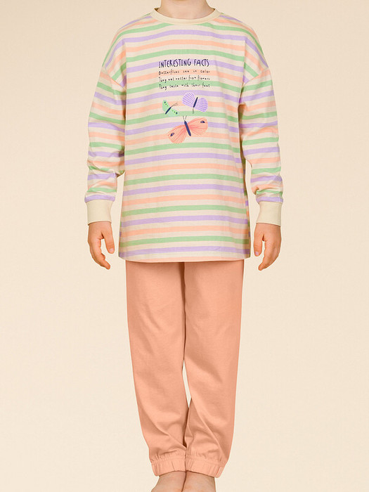 Стильная и уютная пижама в нежных пастельных оттенках для девочки. В составе ткани 100% хлопка — идеально для детской одежды! Модель приятна на ощупь, прекрасно пропускает воздух, позволяя коже ребёнка дышать. При этом в пижаме из хлопка ребёнку будет тепло, даже если он сбросит одеяло. Всё это обеспечивает комфортный и качественный сон. Джемпер и брюки среднего объёма, плечо немного спущено, рукава широкие и свободные — в пижаме очень удобно спать. Широкая и мягкая резинка в поясе не перекручивается и не давит. Манжеты и отделка горловины из эластичной рибаны — она не растягивается, ребёнку удобно надевать и снимать пижаму. Брюки однотонные, персикового цвета. Джемпер в полоску украшает милый принт в виде бабочек. Надписи переводятся: "интересные факты", "бабочки видят в цвете", "они питаются нектаром с цветов", "вкусовые рецепторы у них находятся на лапках". В линейке представлены детские пижамы следующих размеров: 1 (86); 2 (92); 3 (98); 4 (104); 5 (110); 6 (116); 7 (122); 8 (128); 9 (134); 10 (140); 11 (146). Хлопковый комплект идеален для сна как дома, так и в детском саду — прекрасный выбор для вашего ребёнка! Пижама с брюками подходит для круглогодичного использования. Домашний комплект — замечательный подарок дочке, внучке, сестре на любой праздник. Выбирайте нужный размер по таблице размеров на фото. Цвет товара на экране вашего устройства может отличаться от цвета изделия вживую.