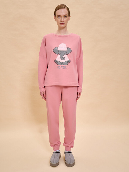 Теплая пижама женская. В составе ткани (футер с начёсом) преобладает высококачественный хлопок — комплект для сна мягкий, гипоаллергенный и хорошо пропускает воздух. В хлопковой пижаме вам будет тепло и уютно во время сна. Эластан помогает модели надолго сохранить первоначальную форму. Джемпер и брюки умеренного объёма, плечо джемпера спущено, спинка чуть длиннее переда— в пижаме очень удобно спать. В поясе брюк мягкая и широкая резинка — не перекручивается и не давит. Отделка горловины из эластичной рибаны — она не растягивается, пижаму удобно надевать и снимать. Хлопковая пижама украшена милым, «няшным» принтом в виде медитирующего слоника, надписи переводятся: «никакой спешки», «не беспокойтесь» — почувствуйте себя уютно и беззаботно. Шляпка и майка слоника — аппликация из тактильного приятного бербер-флиса с нежной фактурой барашка. Пижамный костюм неприхотлив в уходе. Принт эластичный и мягкий, хорошо переносит частые стирки. Пижама женская с брюками подходит как для сна, так и просто для отдыха дома. Помните о правильном уходе за изделием: рекомендуется стирать при температуре не выше 30 °C, без предварительного замачивания, с изнанки. Это поможет сохранить качество и цвет пижамы на длительное время.
