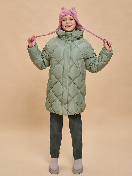 Куртка зимняя для девочки длиной до середины бедра. Модная пухлая куртка-зефирка украшена актуальной стёжкой в виде квадратных ромбов. На внешнюю поверхность материала нанесена водоотталкивающая пропитка (DWR), она задерживает грязь и влагу снаружи — ребёнок не промокнет от снега, а комбинезон легко отстирается. Также есть дополнительная пропитка на внутренней стороне ткани — для более надёжной защиты от промокания. Капюшон с двумя швами, что обеспечивает анатомически правильную форму и комфортную посадку по голове. По краю капюшона вставка, которая также придаёт милый эффект пухлости. Предусмотрена регулировка объема капюшона эластиком с пластиковыми стопперами. Подкладка капюшона и внутренний воротник из нежного и тактильно приятного бербер-флиса с фактурой «барашек». Центральная застёжка на  надежную пластиковую тракторную молнию. Куртка теплая — дополнительно, для защиты от ветра и холода, центральная молния закрыта ветрозащитной планкой на липучке (велькро). По низу рукавов внутренние манжеты из эластичной рибаны — они препятствуют задуванию ветра. Низ куртки и низ рукавов присобраны на широкую резинку с внутренней стороны, чтобы дополнительно придать изделию мягкий объём — пуховик напоминает лёгкое тёплое облачко.  Можно также дополнительно уменьшить объем по низу куртки с помощью эластичного шнура по стопперами. По бокам удобные прорезные карманы, закрываются на магниты — легко открывать и закрывать даже в варежках или перчатках. Справа внутри карман на молнии для важных мелочей. Карманы утеплены флисом. В каждой куртке есть нейм-лейбл! Ребенок не потеряется и не потеряет куртку! В боковых швах и на спинке расположены светоотражающие элементы — безопасность в тёмное время суток. Изделие неприхотливо в уходе. Модель без принта. Куртка с наполнителем из полиэстера — она тёплая, легко стирается, быстро сохнет, сохраняет отличную форму и цвет надолго. Подкладка из мягкого и тёплого флиса. Отличная куртка для девочки дошкольного и младшего школьного возраста, а также девочки-подростка. Идеальная, тёплая и красивая куртка на зиму. Рекомендуемый температурный режим: не ниже минус 30 градусов. Утеплитель: экопух. Зимний пуховик подходит для носки в детский сад, школу, для прогулок и активного зимнего отдыха, игр на свежем воздухе. Помните о правильном уходе за изделием: рекомендуется стирать при температуре не выше 30 °C, без предварительного замачивания, с изнанки. Это поможет сохранить качество и цвет куртки на длительное время.