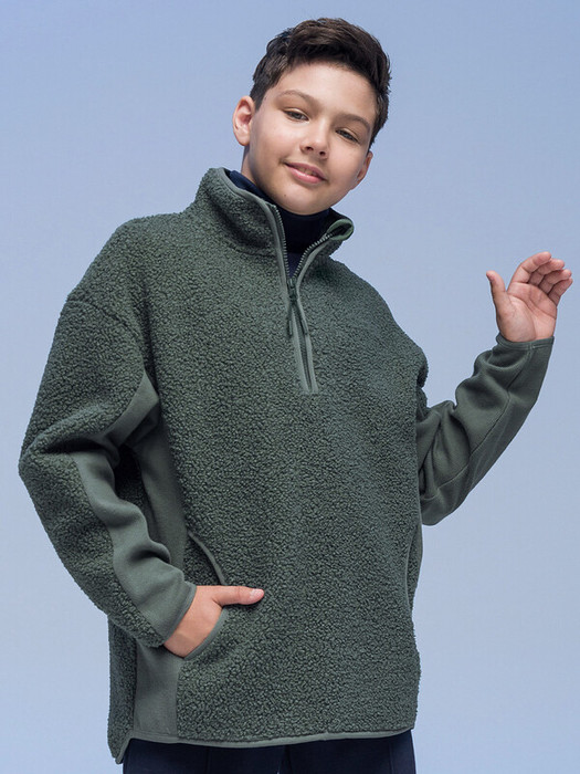 Детская толстовка на мальчика выполнена из мягкого бербер-флиса (фактура «барашка»). Вставки по бокам и рукавам из футера с начесом. Сочетание материалов с разной фактурой — один из модных трендов. Джемпер оверсайз-силуэта со спущенным плечом и увеличенной проймой подарит ребёнку комфорт и свободу движения.  Толстовка с воротником-стойкой защищает шею от холода и ветра, нет необходимости дополнительно надевать шарф. По переду застёжка на короткую молнию, что актуально в этом сезоне. Тканевый стоппер защищает подбородок от зажима молнией. Низ изделия фигурный, спинка слегка длиннее переда, рукава книзу заужены. По переду фигурные карманы — удобно пользоваться. Воротник, застёжка, низ толстовки, рукава и карманы окантованы эластичным пайпингом, что помогает изделию сохранять форму и при этом не растягивается при носке. Джемпер однотонный, без принта. За ним просто ухаживать. Одежда из бербер-флиса тёплая, лёгкая, мягкая, просто стирается и быстро сохнет, не выгорает и не скатывается, надолго сохраняет первоначальную форму. Вставки из 95% высококачественного хлопка. Он мягкий и дышащий. 5% эластана не даёт терять форму, растягиваться. Толстовка на молнии без капюшона выполнена в стильном и практичном зеленом цвете. Она легко комбинируется с различными брюками. Размерный ряд: 1 (86); 2 (92); 3 (98); 4 (104); 5 (110); 6 (116); 7 (122); 8 (128); 9 (134); 10 (140); 11 (146). Плюшевая толстовка подходит малышам, мальчикам дошкольного и младшего школьного возраста, а также подросткам. Она идеальна для детского сада, прогулок, активного отдыха, спорта и дома. Толстовка на замке подходит для круглогодичной носки: прохладным летом, осенью, зимой, весной и демисезон. Это замечательный подарок сыну, брату, внуку или племяннику на Новый год и любой другой праздник.