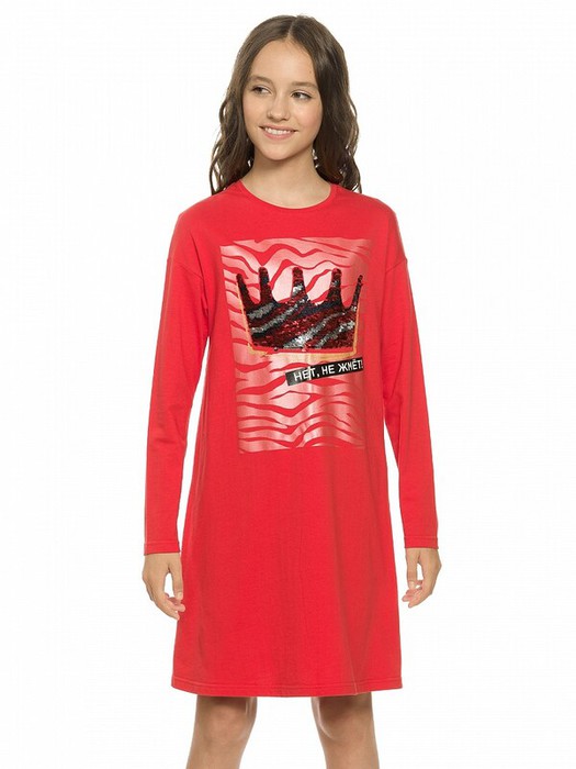 Платье свободного объёма, силуэт трапеция. Glossy rubber принт с розовым металликом и золотым глиттером. Корона из переворачивающихся пайеток.