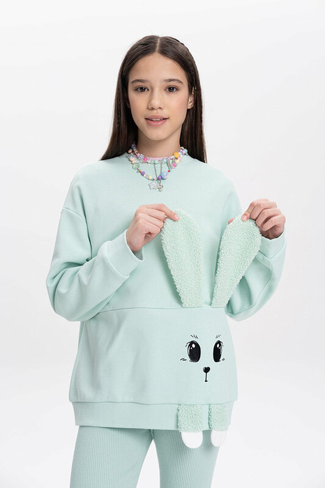 Свитшот с принтом зайчика: ушки и лапки из меха, подходит для девочки подростка. Модный джемпер из высококачественного хлопкового футера можно носить круглый год весной, летом, осенью и зимой. Кофта без капюшона подойдет для повседневной носки для занятия, в школу, в сад и на прогулку.
