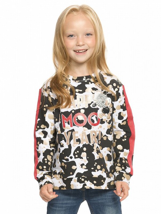 Свитшот из хлопкового футера с эластаном. Манжеты из основной ткани. Алловер и glossy rubber принт с золотом и разноцветным глиттером.  Яркие лампасы из репсовой тесьмы с люрексом. Перевод Счастливого МУУ года.