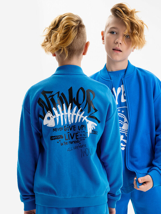 Бомбер для мальчика – трикотажная модель свободного кроя.  Изделие выполнено из смесовой ткани с высоким содержанием хлопка и небольшим добавлением полиэстера.Бомбер на центральной застежке молнии, со спущенным плечом и углубленной проймой. Воротник, манжеты по рукавам и низу изделия - из рибаны. Боковые карманы с листочками расположены на переде под наклоном. Бомбер декорирован принтом и надписями. Перевод принта: никогда никогда не сдавайся; наслаждайся; Ты можешь совершать великие дела. Живи настоящим. Всё, что у нас есть, — это настоящее.