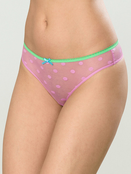 Прозрачные женские трусики-стринги с низкой посадкой. Эластик с сердечками по линии талии, мягкая сетка в горошек, яркие цвета – идеально для лета. Легко и комфортно. Трусы едва заметны и ощутимы под одеждой. Легко комплектовать с топом Pelican.