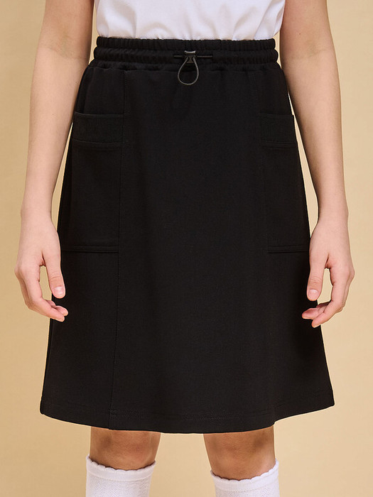 Юбка для девочки А-силуэта выполнена из смесового трикотажного полотна. Передняя и задняя половинки юбки с вертикальными рельефами, с двойными отстрочками. Спереди на боковых частях юбки расположены карманы, декорированные сверху декоративным рибом 1*1. Юбка с притачным поясом, собранным на эластичную резину, с двумя отсрочками. В поясе также спроектирована дополнительная регулировка с помощью эластичного шнура и стоппера.