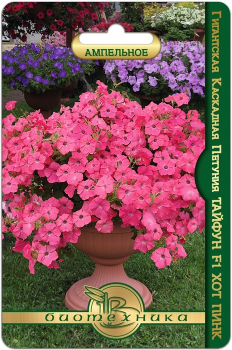 Каскадная серия Тайфун - это необычное мощное растение, не имеющее аналогов среди других петуний.; Цветет весь сезон, образуя большое число мощных, твердых стеблей, длиной до 1,5 метра.; Обладает необычной скоростью роста и мощью, формируя многие сотни цветков (размером около 5 см).; Одно растение на клумбе разрастается на площади около 2 м2 Вид "Тайфуна" зависит от близости посадки растений друг к другу. При посадке на клумбах рекомендуется расстояние 70 см (минимально 35см), иначе растения будут тянуться вверх.; Высадка: март-апрель. Для прорастания требуется свет, температура +20 +24°С. Пикировка в фазе 2-3 настоящих листьев в 10 см горшки. Грунт pH 5,5-6,5.; Выращивание рассады: для получения хорошего результата ежедневно 5-6 часов прямого солнечного света. Световой день 14-16 часов.; Высадка в грунт: когда минует угроза заморозков. В светлое место в грунт или большие контейнеры (30 см и более). При надламывании стеблей ветром поврежденные участки не отрезать, они хорошо восстанавливаются.; Подкормки: регулярные, комплексными жидкими удобрениями для цветов. После высадки на окончательное место при каждом поливе.; ; Гигантские ампельные петунии Тайфун и Торнадо