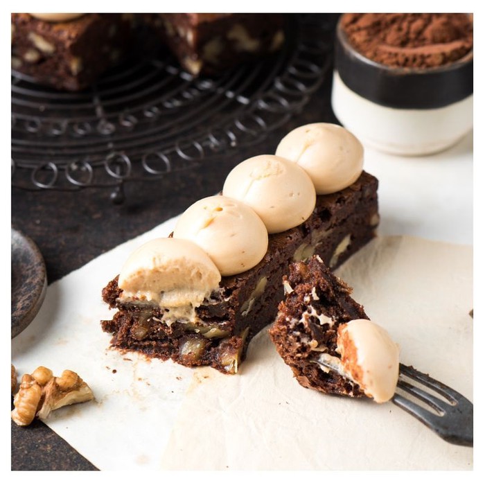 Брауни, приготовленный на темном 53% шоколаде, с грецким орехом и взбитой соленой карамелью.