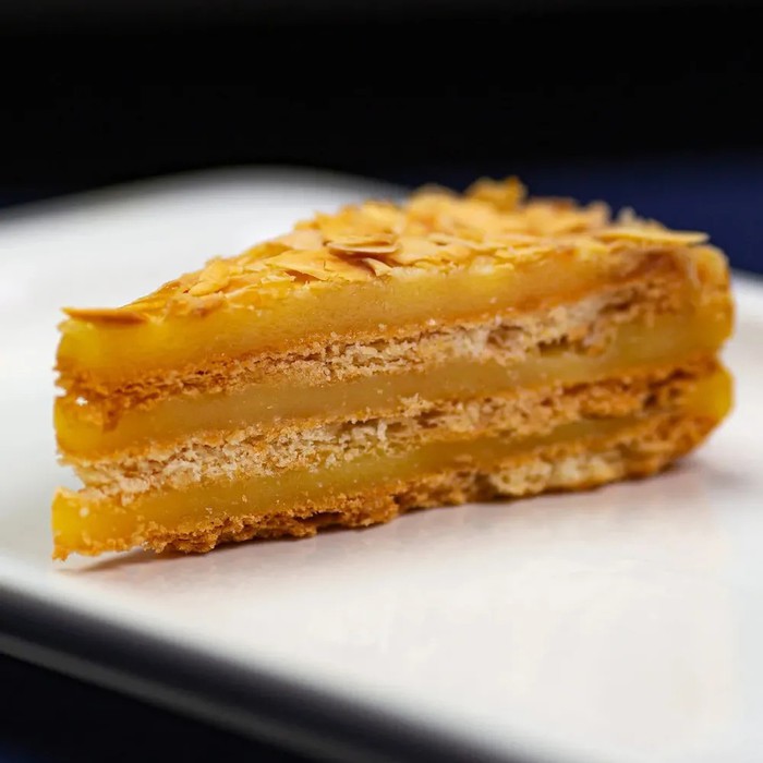 Состав: миндальная мука, масло сливочное традиционное, крем сливочный ультрапастеризованный, сухая смесь для приготовления заварного крема, миндаль бланшированный.