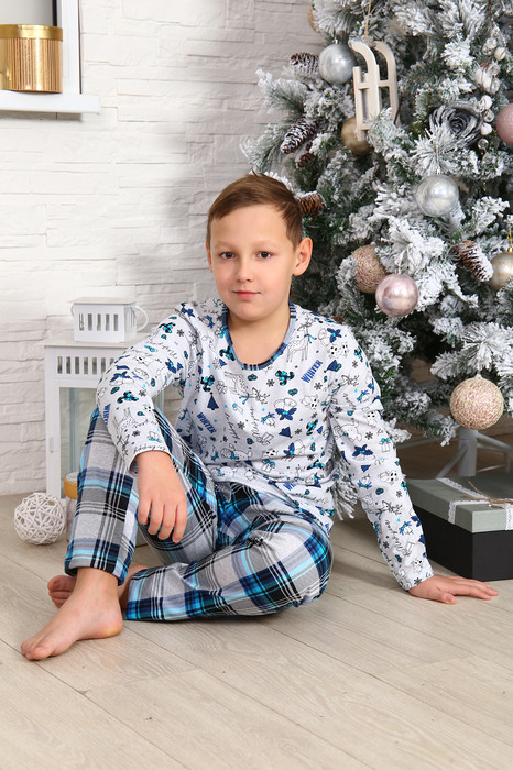 Пижама детская кофта и брюки. Кофта с длинным втачным рукавом. Горловина округлой формы, обработанная окантовка. Низ рукава и изделия - подгибка. Брюки прямого силуэта с поясом