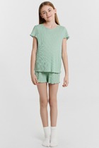 Пижама детская на кнопках. Полочка отрезная под грудью. Горловина и пройма обработаны окантовкой. На шортиках присутствуют карманы и пояс с эластичной резинкой. Подходит для отдыха и сна