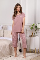 Пижама женская из трикотажного вискозного полотна с набивным рисунком, с отделкой кружевом, состоящая из майки и шорт. Майка - слегка расширенная книзу, с кружевной вставкой-кокеткой V-образной формы и небольшой драпировкой в центре груди.Шорты – удлиненные, с эластичной тесьмой по талии.