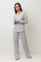 Пижама-рубашка выполнена из мягкого приятного к телу трикотажа. Модель застегивается на пуговицы, имеет рукав 3/4 и накладной кармашек на груди. Особенность модели - свободный крой, который не сковывает движения во время сна. Интересный принт "перья" дарит ощущение невесомости и подчеркивает женственность. В такой уютной рубашке Вы будете видеть только самые красивые яркие цветные сны.