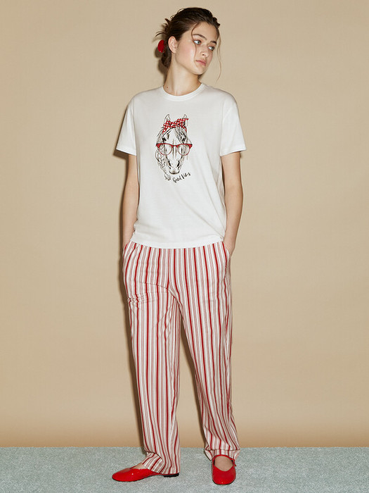 Женская пижама с трендовым принтом: классическая футболка с коротким рукавом и круглым вырезом, а также прямые брюки с карманами и поясом на резинке.