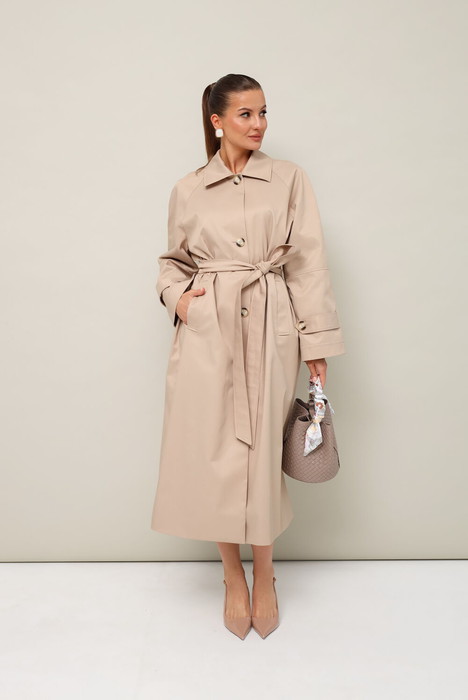 Плащ в длине миди, выполнен из ткани с водоотталкивающей и грязеотталкивающей обработкой. Силуэт слегка расширенный к низу. Отложной воротник с цельнокроеной стойкой. Центральная застёжка на петли и пуговицы. Спереди функциональные карманы-листочки. Рукава кроя реглан, по низу обработаны паты с застежкой на пуговицы. Спинка со средним швом со шлицей по низу. Плащ на подкладке.