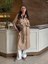 Плащ женский полуприлегающего силуэта предназначен для повседневной носки. Перед с двумя нагрудными вытачками, с двумя отрезными бочками, в швах их соединения с передом обработаны карманы. Спинка со средним швом, заканчивающимся шлицей. Горловина круглая, с втачным воротником с отрезной стойкой. Застежка центральная двубортная на 14 пробивных металлических кнопок. Рукав втачной, двухшовный, длинный, низ рукава с тремя настрочными шлевками, в которых держится хлястик из отделочной ткани, закрепленный в пряжку. Плащ с плечевыми накладками. Плащ на притачной подкладке по низу. К плащу прилагается съёмный пояс из отделочной ткани с пряжкой. Плащ со съемным жилетом, длиной до линии лопаток. Перед с нагрудными вытачками и одним настрочным прямоугольным клапаном слева. Спинка цельнокроеная. Горловина, проймы и низ обтачные. Жилет на подкладке без застежки. К плащу крепится на пуговицу на горловине спинке плаща под воротником. Длина плаща 116 см. Длина рукава 61 см. Длина жилета 36 см