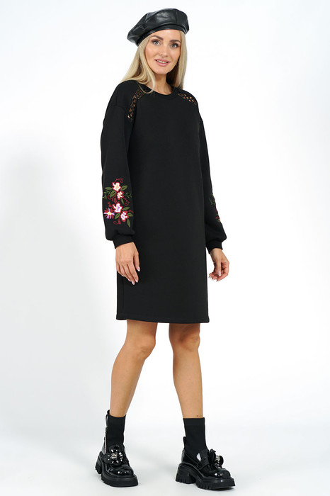 Платье женское прямого силуэта, со спученной линией плеча, рукава понизу декорированы вышивкой.   Перед с притачными каскетками в шве соединения с отделочной тесьмой «кружево». Горловина с втачной бейкой. Рукава длинные, одношовные, понизу с притачными манжетами. Бейка горловины, манжеты рукава выполнены из отделочной ткани «довяз».