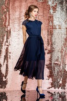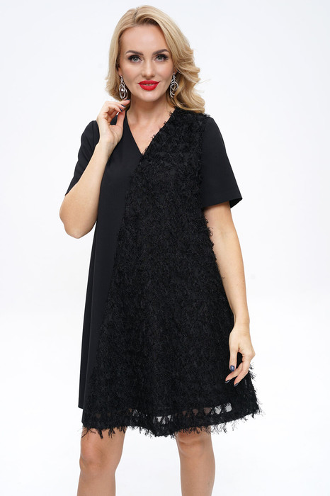 Платье А-образного силуэта, с V-образным вырезом. Перед с нагрудными выточками, разрезной правая часть из отделочной ткани и на подкладке. Спинка со средним швом. Рукава втачные, одношовные, короткие.
