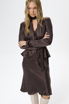 Платье верхняя часть полуприлегающего силуэта, нижняя из трёх воланов собранных на сборку, с застёжкой по плаке на петли, пуговицы, чуть спущенное плечо. Перед с нагрудными выточками. Спинка с талевыми выточками. Воротник стояще-отложной на отрезной стойке застёгивающийся на петлю, пуговицу.