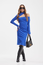 Платье А- образного силуэта, на подкладке. Перед с нагрудными выточками. Спинка со средним швом с разрезом и застёжкой на навесную петлю и пуговицу. Рукава втачные, одношовные, короткие.