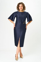 Платье полуприлегающего силуэта, с застёжкой на потайную молнию в среднем шве спинки. Перед с нагрудными и талевыми выточками. Спинка с талевыми выточками, понизу щлица. Рукава втачные, одношовные, короткие.