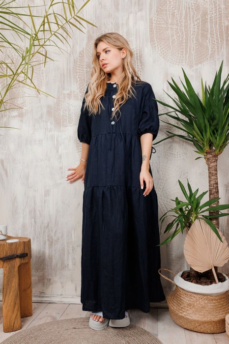Шикарное льняное платье  "АМУЛЕТ"в  свободном облегании. По переду застежка на пуговки из натуральной ракушки и завязки у горловины, в швах имеются удобные карманы, по юбке два ряда валанов, рукава  на сборочке с завязками. Наши платья дают невероятное чувство комфорта, защищенности и красоты.  Все изделия коллекции "АМУЛЕТ" имеют натуральную ткань, сложную обработку всех внутренних швов и  энергосберегающий крой. В подарок идет шопер с логотипом бренда.